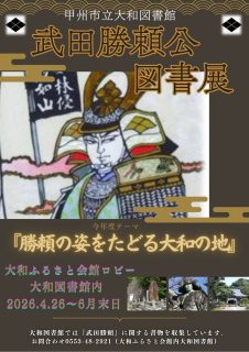 資料展示『武田勝頼公図書展』 今年度テーマ『勝頼の姿をたどる 大和の地』で展示をします。 4月26日(日)~6月末日までとなります。 https://www.lib-koshu.jp/news/4445/